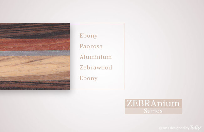 コクタン、パロッサ、ゼブラウッドの間にアルミニウムを挟みました